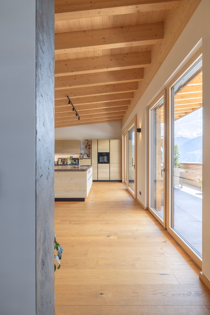 Bei diesem Projekt zogen wir die Brettsperrholz-Trumpfkarte: Abbruch des Dachstuhls und Aufstockung des zweiten Stockwerks binnen einer Woche. Das ist echte Zeiteffizienz! Die schönen Nebeneffekte, wie die positive Ökobilanz, die gute Planbarkeit, das verhältnismäßig geringe Gewicht und der einzigartige Charakter des Holzes, sollen hierbei nicht unerwähnt bleiben
