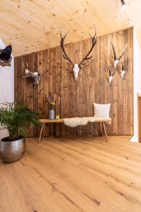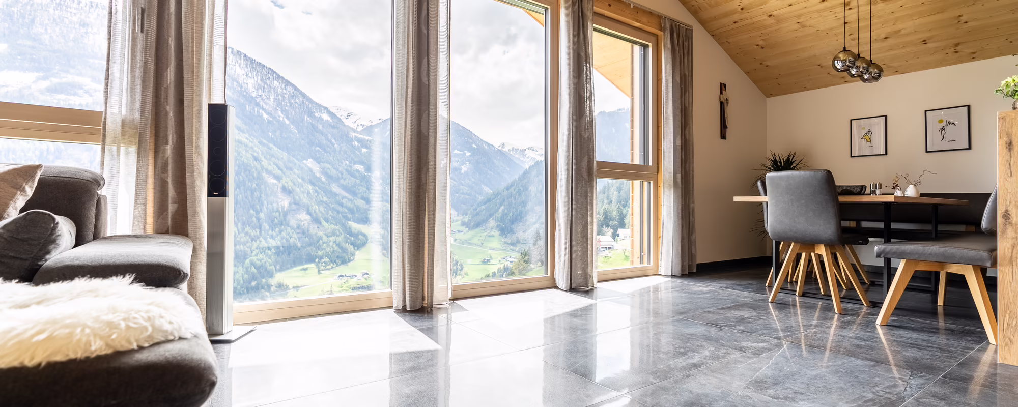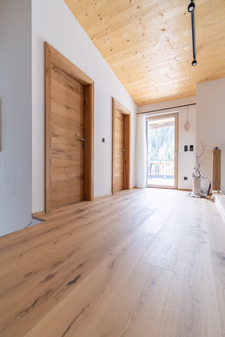 „Florian wollte über das Zusammenspiel von Fenster und Innenarchitektur ein harmonisches Bild schaffen. Das Holz der Innentüren und der Fenster sollte mit den Holzböden im Einklang zusammenpassen. Wichtig war, dass die Fenster die schöne Natur so zu sagen ins Wohnzimmer holen. Wir haben daher eine große Fensterfront auf der Südseite verbaut, von welcher aus man die herrliche Aussicht genießen kann – ein schöner Anblick von dem man sich sicher nie absehen wird,“ erläutert Herbert.