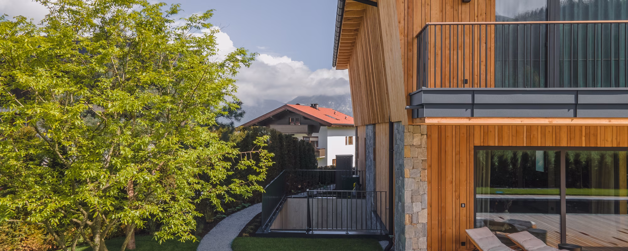 Als besonders charaktergebend präsentiert sich die Fassade. Sie wurde traditionell mit einer vertikalen Schalung in unterschiedlichen Brettbreiten aus hochwertigem heimischen Lärchenholz aus dem Zillertal ausgeführt. An den Gebäudeecken fügen sich harmonisch Natursteine ein. „Uns, als ausführenden Zimmereibetrieb, war es wichtig beim Materialeinsatz auf Regionalität und kurze Transportwege zu achten, um einen ökologischen Fußabdruck zu hinterlassen“, erläutert Stefan Schennach. An drei Seiten des Gebäudes wurden am Obergeschoss nach oben hin schräg verlaufende, massive Lärchenlamellen angeordnet. Die dahinter positionierten Fenster und Türen wurden optisch von außen geschickt abgeschirmt. Dadurch wird dem Haus auf den ersten Blick die Note eines landwirtschaftlichen Gebäudes verliehen. Gehen wir jedoch vor zur Frontseite, so ändert sich der Eindruck schlagartig. Als stünden wir vor einem anderen Gebäude. Es öffnet sich komplett nach Süden hin zur Terrasse, dem Garten und dem Pool: eine eingebettete Oase der Schönheit mit geradliniger Struktur. Fast wie im Märchen – wenn Dornröschen erwacht und alles strahlt und lacht. Die großen Fensterfronten schenken den Bewohnern viel natürliches Licht und erweitern den großzügigen Wohnraum. Mit viel Liebe wurde auch der Garten- und Freizeitbereich rund ums Haus gestaltet – alles bettet sich in ein grünes Idyll. Die Bewohner profitieren im vollen Ausmaß von der schönen, umliegenden Natur. Das RIEDER Team war hier im doppelten Sinn im Einsatz – mit der Hochbau- sowie der Zimmereimannschaft.