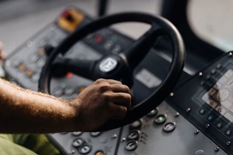 Mit genügend Diesel und AdBlue im Tank schnurre ich dann unkompliziert den ganzen Tag vor mich hin und führe Manuels Anweisungen dank der ErgoPlus 3 Fahrer-Bedienkonsole durch: Verlängerung oder Erhöhung der Materialausgabe, um auf verschiedene Materialien und Einbaustärken flexibel eingehenzu können – und ähnliche Dinge. Zumeist bedient er mich vom Steuerastand und wechselt seine Position je nach Bedarf von links nach rechts. Zum Glück stehen ihm dafür zwei ausklappbare Sitze zur Verfügung. Jedenfalls gestaltet sich jeder Tag anders. Manches Mal wechseln wir sogar drei Mal unsere Baustelle. Wenn die Anfahrt etwas länger dauert, werde ich praktischerweise von Matthias und seinem seinem LKW auf einem speziellen Tiefladermit besonders langen Auffahrtrampen transportiert.