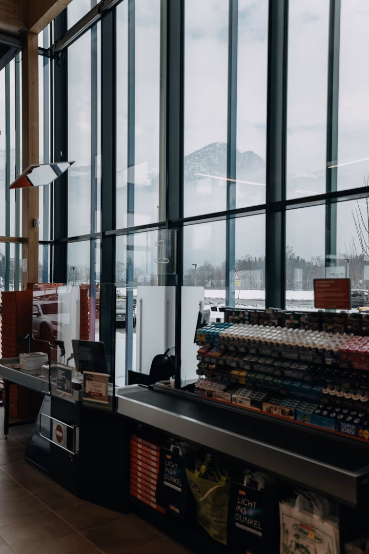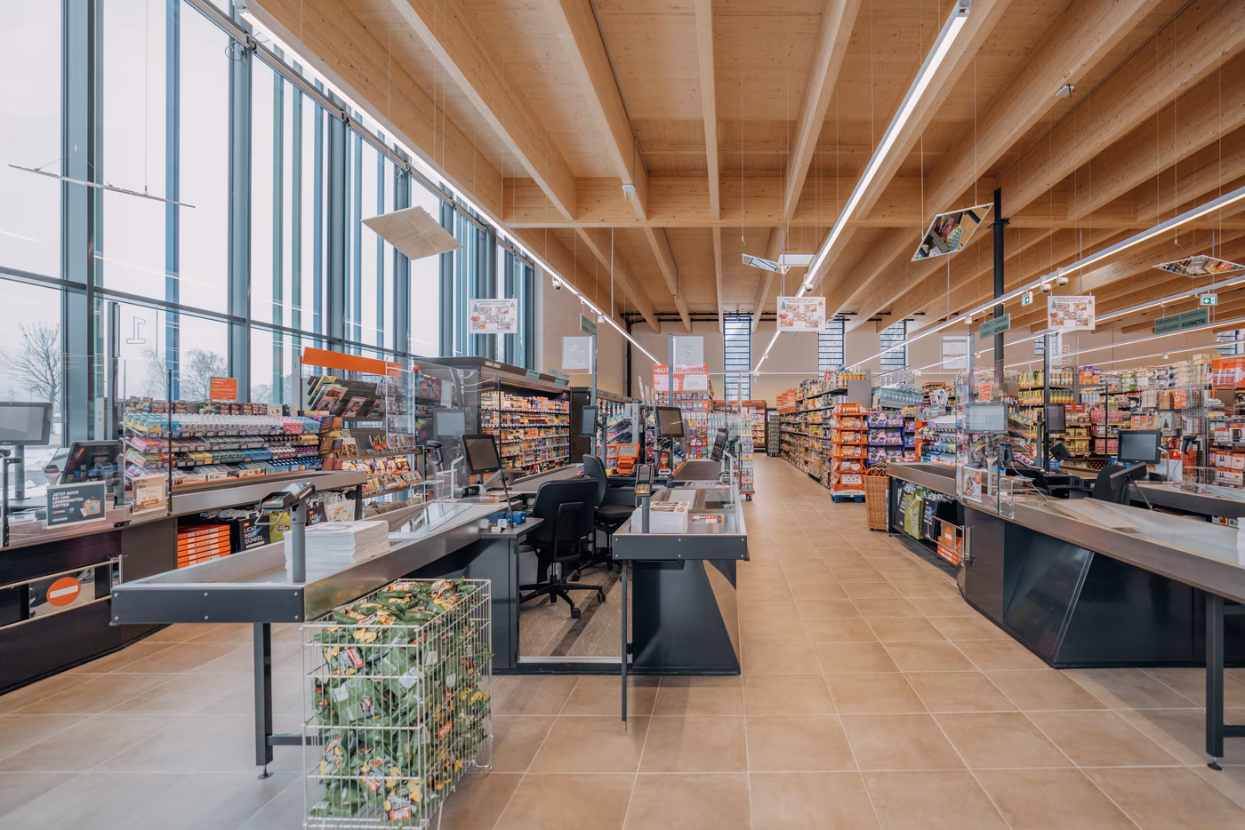 Im Hochbau wurden gemäß den planerischen Vorgaben Hohlwand-Betonfertigteilelemente und VSE-Decken verbaut. Die Dachkonstruktion wurde von unserem Holzbau-Team errichtet. Das Dach des Marktes wurde als „stützenarme“ Flachdachkonstruktion in Brettschichtholz mit Brettsperrholzschalung ausgeführt. Das circa 7.5m auskragende Vordach schützt zusätzlich den Eingangsbereich des Marktes. Das Dach des Lagerbereichs „umschliesst“ den Markt auf drei Seiten und wurde als klassisches Pfettendach in Brettschichtholz ausgeführt.