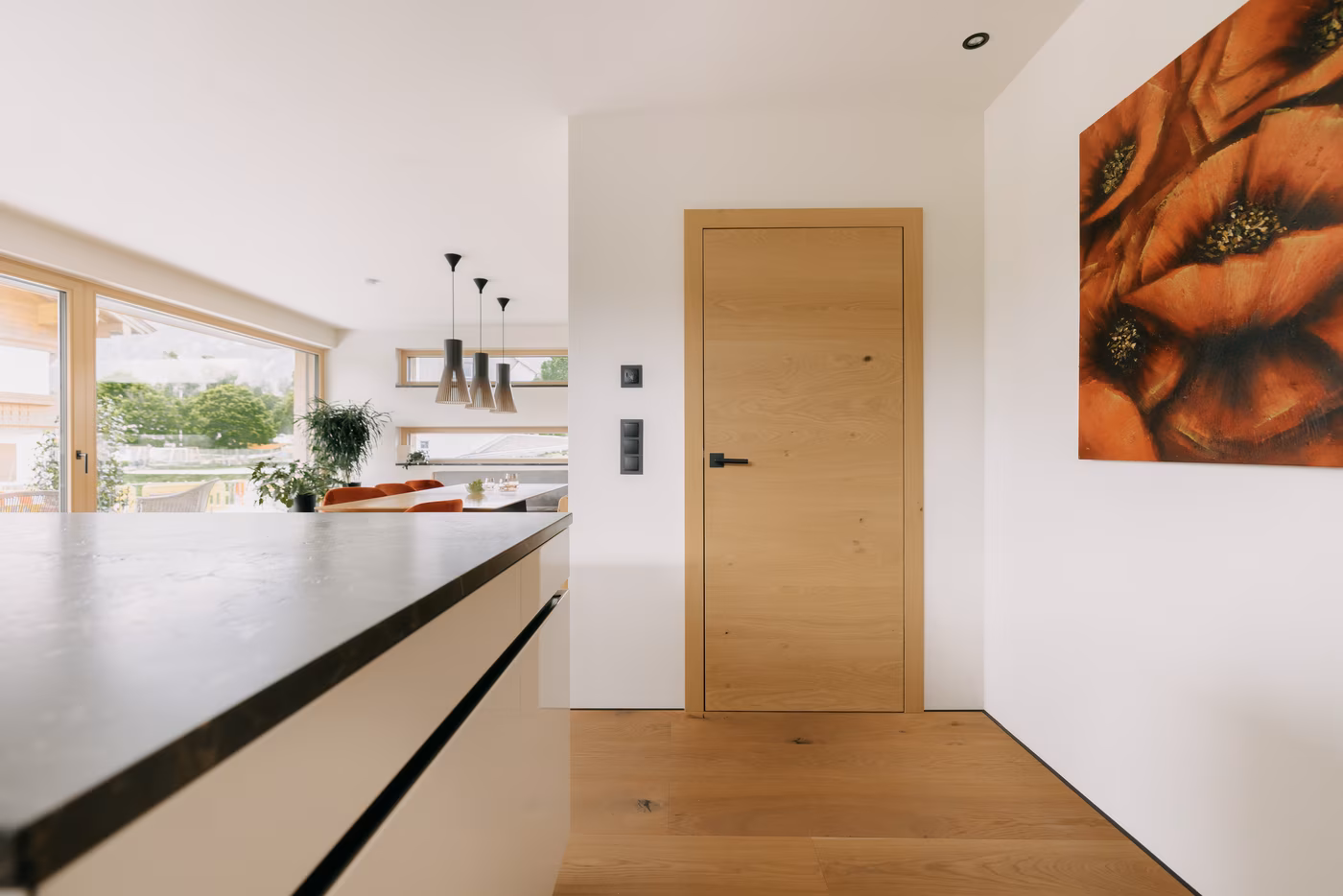 „Ja, erst vor Kurzem durften wir am Angerberg ein hochwertig errichtetes Einfamilienhaus mit einer Haustüre sowie Innentüren ausstatten. Besonders spannend war die Ausführung der Innentüren in gebürsteter, lackierter Asteiche – ein hochwertiges und zugleich natürliches Material. Eine weitere Besonderheit: Die Türen wurden bewusst ohne Schlüsselrosette gefertigt, was dem modernen Wohnkonzept eine besonders klare, reduzierte Optik verleiht. Auch die Haustüre wurde optisch perfekt abgestimmt – samt integriertem Fenster. Die Türen wurden nach dem Kundenwunsch gemeinsam mit RIEDER Zillertal entwickelt, in der Werkstatt gefertigt und von uns vor Ort montiert. Das Ergebnis war nicht nur technisch hochwertig, sondern auch ästhetisch sehr stimmig – der Bauherr war begeistert und beauftragte uns im Anschluss mit weiteren Tischlerarbeiten.“