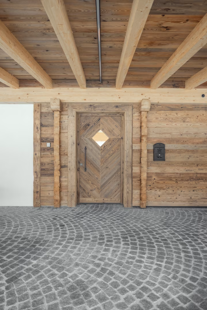 Dem Holzbau sind heute fast keine Grenzen gesetzt. Nicht nur die unterschiedlichen Holzarten, auch die Bearbeitungsmöglichkeiten, um bestimmte Effekte und Looks zu kreieren, lassen mittlerweile keine Wünsche mehr offen. Das Immocenter legte bei ihrem Neubau Wert auf die Verwendung von Original-Altholz, um eine natürliche Gemütlichkeit zu schaffen. Im Innenausbau dominieren gehackte Altholzbretter, die wie bei einer Blockbauweise anmuten und mit Tiroler Schloss montiert wurden. Als besondere Hingucker und für eine optische Auflockerung wurden bei den Zwischenwänden Schlussschrot-Elemente eingefügt, welche für uriges Ambiente sorgen.