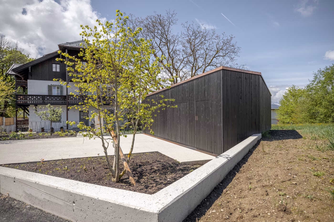 Im komplett konträren Sinn dazu errichteten wir im vergangenen Jahr in Massivbauweise eine Garage sowie ein Gartenhaus – beide in kubischer Architektur. Schlicht und modern wurden die Fassaden ausgeführt und es entstand eine optische Besonderheit: sämtliche Öffnungen, wie Garagentore und Türen „verschwinden“ in der Fassade. Grund dafür ist die komplett flächig ausgeführte Fassadenbekleidung, ohne Vor- und Rücksprünge. Einen zusätzlichen besonderen Touch verleiht den beiden Bauwerken die dunkle, witterungsbeständige Holzlasur. Fein abgestimmt zum Gesamtkonzept wurde auch die Dachkonstruktion des Gartenhauses errichtet: als Kehlbalkendach in Fichtenholz und Sichtdachkonstruktion mit feinem Bandsägeschnitt. Die Schiefereindeckung des Daches komplettiert das gelungene Gesamtarrangement des Gartenhauses. Als gemeinsame Komponente findet man die Farbgebung in allen drei Gebäuden wieder.
