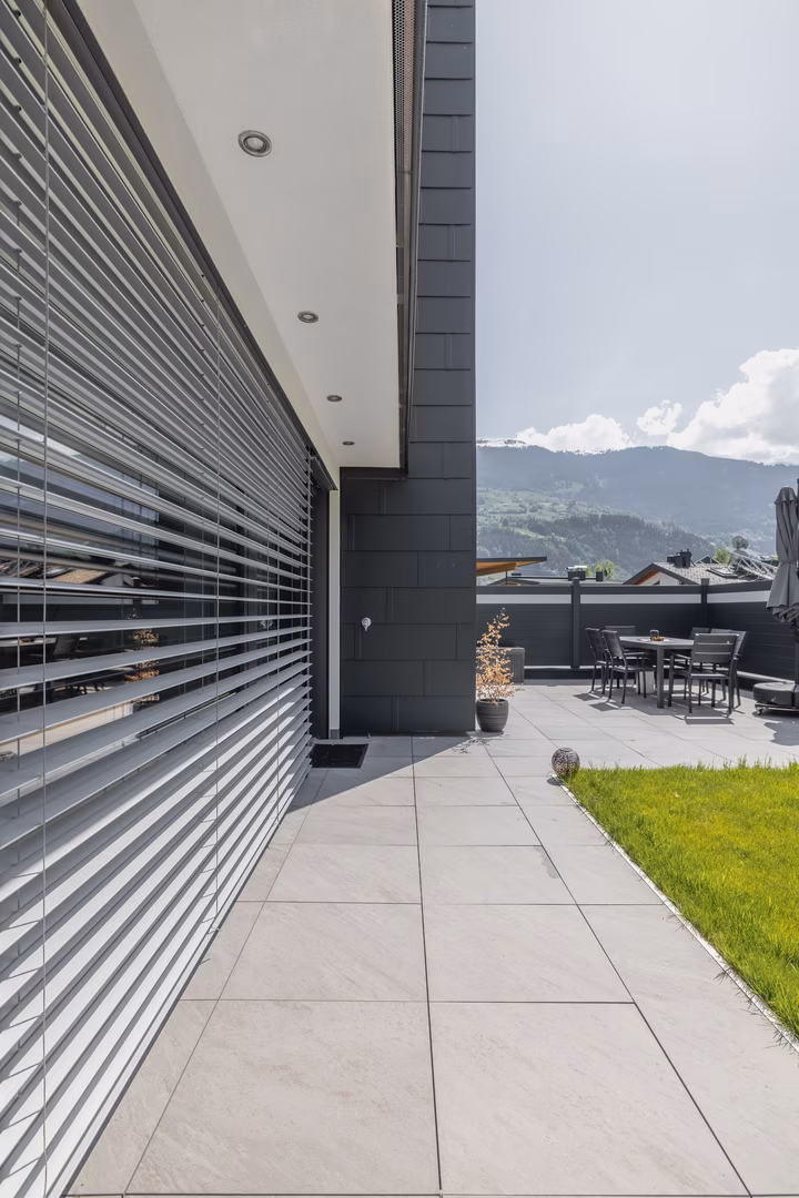Zur Architektur passend, wurde auch großen Wert auf die Auswahl der Fenster und Türen gelegt. Stilsicher entschieden sich die beiden bei den 34 Fenstern für eine Ausführung in 78er Holz-Aluminum 3-fach-Verglasung und wählten den Innenrahmen in Fichte farblos. Als Beschattung wurden Alu-Raffstores verbaut. Zwei große Hebe-Schiebetüren lassen die Natur in den schönen Wohn-Essbereich, über welchen man auf die Terrasse gelangt. Ein weiteres Highlight ist das Panoramafenster im Schlafzimmer. Das junge Paar wacht morgens mit freiem Blick auf die Zillertaler Bergwelt auf. Einfach wunderbar traumhaft.