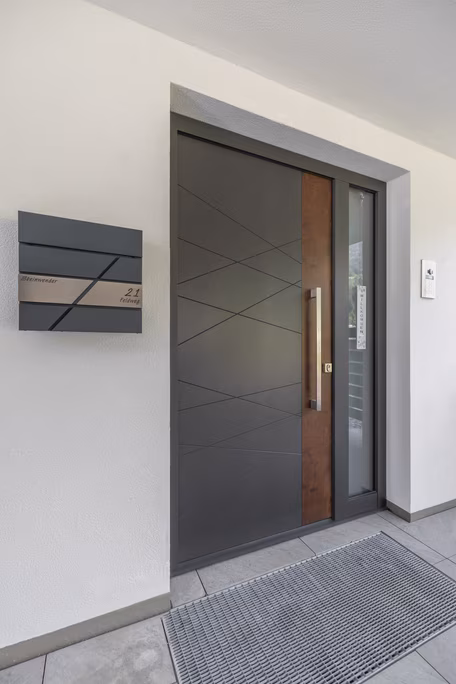 Die geschmackvollen Innentüren in Asteiche geölt versprühen Wärme und bringen ein heimeliges Wohnambiente in die Räume. Bei der Auswahl der Haustüre, war dem jungen Paar eine Optik, passend zur Außenfassade, wichtig. Das Haus der beiden ist ein schönes Beispiel dafür, dass sich Naturverbundenheit wunderbar mit Modernität kombinieren lässt.