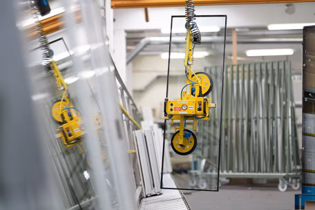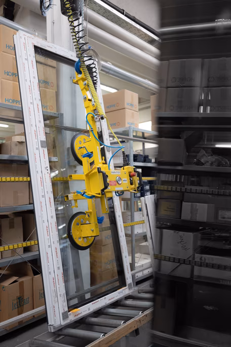 Qualität bedeutet ebenfalls, die Produktionsprozesse immer wieder zu prüfen und, wenn notwendig, anzupassen. Wir arbeiten stetig an Verbesserungen, um unsere Fenster über optimale Fertigungsabläufe qualitativ einwandfrei herzustellen. Der neue Kran, als Erweiterung der Anlage unseres Kunststoff-Fensterwerks, ist perfekt, um die Produktionsschritte noch flüssiger durchlaufen zu können und damit auch eine höhere Effizienz zu erzielen. Die Fertigungslinie verfügt nun über zwei Kräne (ein Kran von links und ein zweiter Kran von rechts), welche unserem Team die präzise Montage der Fenster wesentlich erleichtern. Die Fertigungsanlage misst, durch die Erweiterung der Rollbahn-Schiene, nun fast 20 Meter und die vorherige Engstelle im Produktionsablauf konnte durch den Einsatz des zweiten Kranes optimal ausgeglichen werden.
