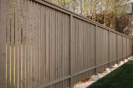 - 43 lfm Sichtschutzzaun, Latten schräg geschnitten (Parallelogramm) für besten Sichtschutz, farblich der Holzfassade angepasst