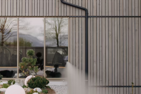 - 200 m² Fassadenschalung Lärche sägerau (grau lasiert), vorgefertigte Elemente ohne sichtbare Schrauben (verdeckt verschraubt)