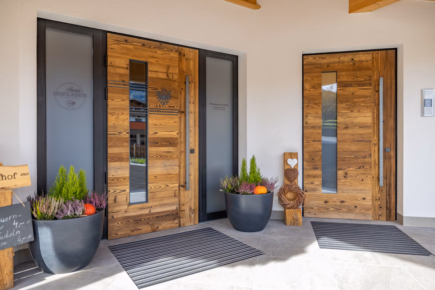 Die vier neuen RIEDER Haustüren verleihen dem Gästeerlebnis in den Greidlhof Appartements und in Annis-Hofladen einen würdigen Auftakt! Warme Türen, die verbinden, begrüßen und verabschieden. Passend zum Erscheinungsbild des neuen Gebäudes, entschied sich der traditionsbewusste Kunde für rustikale Außentüren im Altholz-Design. Der mit Lasertechnik in das Türblatt eingearbeitete Adler, verspricht den Zutritt zu einem Tiroler Juwel - am Puls der Zeit!