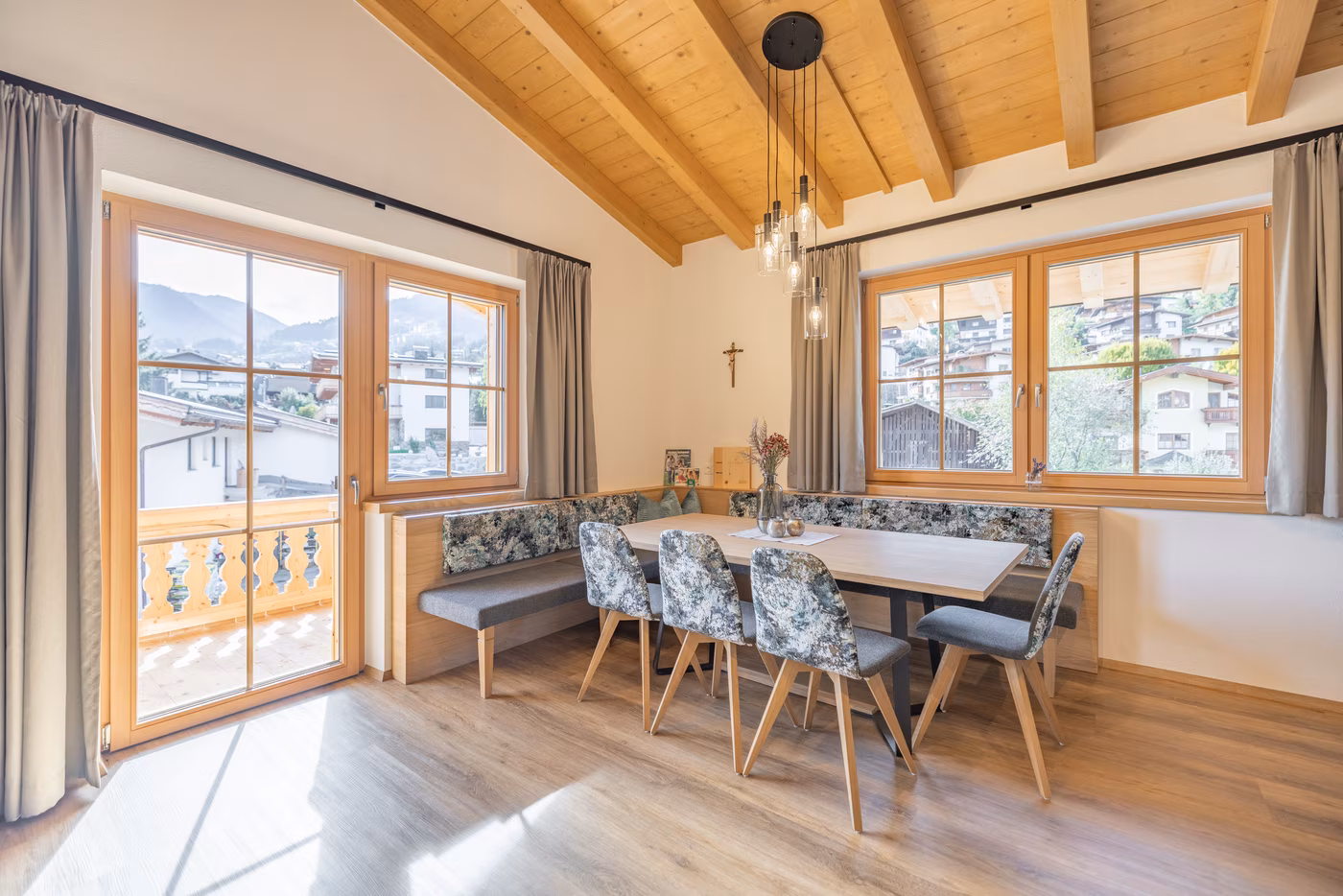 Um den Bauzeitplan zu gewährleisten, wurden noch während der Rohbauphase die Blindstöcke eingebaut. In der Jahresmitte 2022 wurde die Fassade mit unseren lokal gefertigten Fenstern aus beständigem Douglasien-Holz (RIEDER Holz-Fenster HO78) vervollständigt. Integrierte Holzsprossen erzählen Geschichten von alpenländischer Lebensart und verleihen dem Gebäude seinen einzigartigen Charakter. Der natürlich gewachsene Rohstoff Holz gilt als besonders wetterbeständig und wirkt sich in seiner einmaligen Beschaffenheit positiv auf das Raumklima der heimeligen Appartements aus. Im Kellerbereich setzen die Fenster-Profis auf die bewährten Kunststoff-Alu Fenster (RIEDER PVC 8000) aus dem Kunststofffenster-Werk in Telfs.