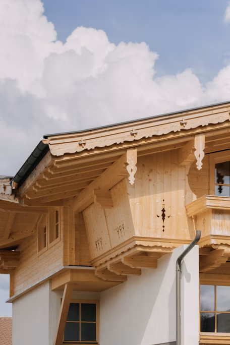 Aufwändige Schnitzarbeiten, wie gezopfte Balustraden, und sorgfältig gestaltete Ausschnitte charakterisierten die Fassade des elterlichen Einfamilienhauses. Mit Respekt und Bewusstsein für die hohe Qualität dieser Arbeit, wurden diese künstlerischen Details im aufgestockten, zweiten Stockwerk wiedergegeben. Das äußere Gesamtbild wurde im regionaltypischen Landhausstil realisiert und präsentiert sich harmonisch-schön.