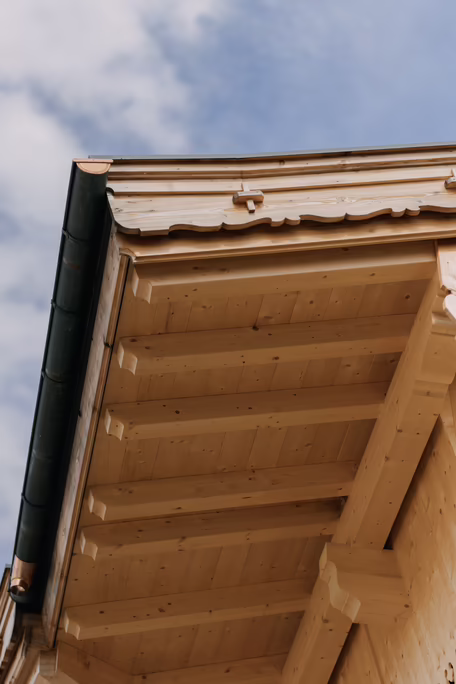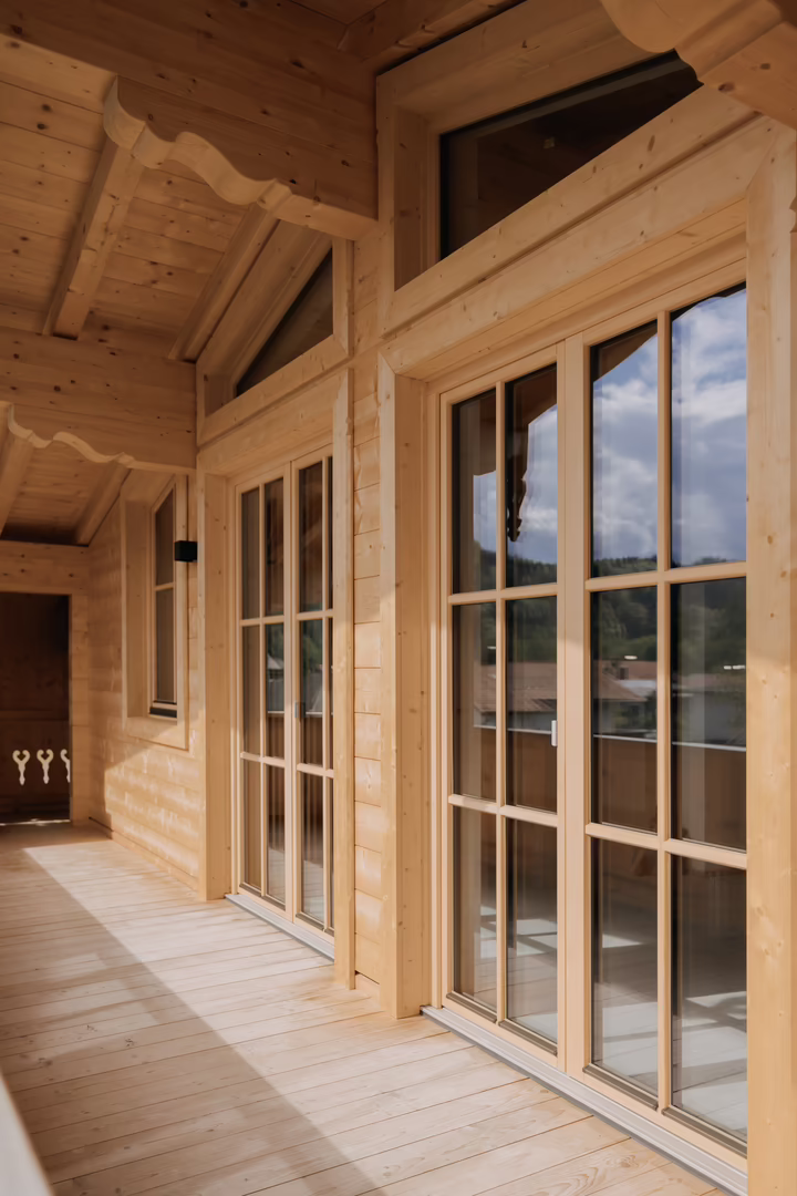 Für die Verkleidung der Fassade fieldie Wahl auf Fichte Natur. Damit die Außenansicht des Gebäudes insgesamt harmonisch wird, wurden die feinen Holzarbeiten beim Neubau zum größten Teil vom Bestand kopiert und wiedergegeben – die Windläden, der Balkonverbau und natürlich der Balkon selbst sprechen für sich. Beim ersten Obergeschoss wurde der Balkon sandgestrahlt, die Fassade neu verschalt sowie mit Fensterläden bestückt. Passend dazu wählte der Bauherr für die beiden Obergeschosse RIEDER Fenster in Fichte Natur tauchgrundiert, 3-fach-verglast mit Fixsprossen innen und außen. Die Giebelfenster sorgen für noch mehr Tageslicht in den Innenräumen. Seit Oktober 2024 sind die Zimmermannsarbeiten abgeschlossen und die Aufstockung fügt sich homogen ins Dorfbild ein.