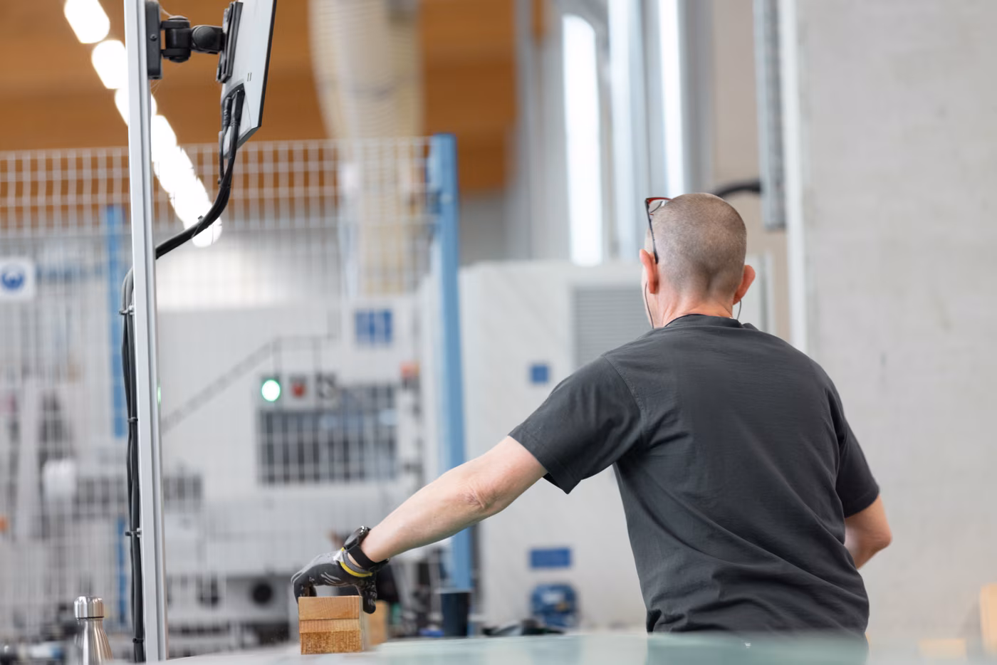 Nun werden die Blendrahmen (händisch) und Flügel (automatisch mittels Clips Portal und Robotern) getrennt voneinander angeschlagen. Anschließend hängt man die Flügel in die Rahmen ein. Parallel dazu werden Sonderelemente und Sprossen produziert sowie Aluminiumprofile für Holzfenster und Hebe-Schiebe-Elemente zugeschnitten und montiert. Im nächsten Schritt werden die Gläser eingebaut. Holzfenster werden mit Silikon noch versiegelt, Holz-Alufenster mittels vorher eingezogener Gummidichtung abgedichtet.