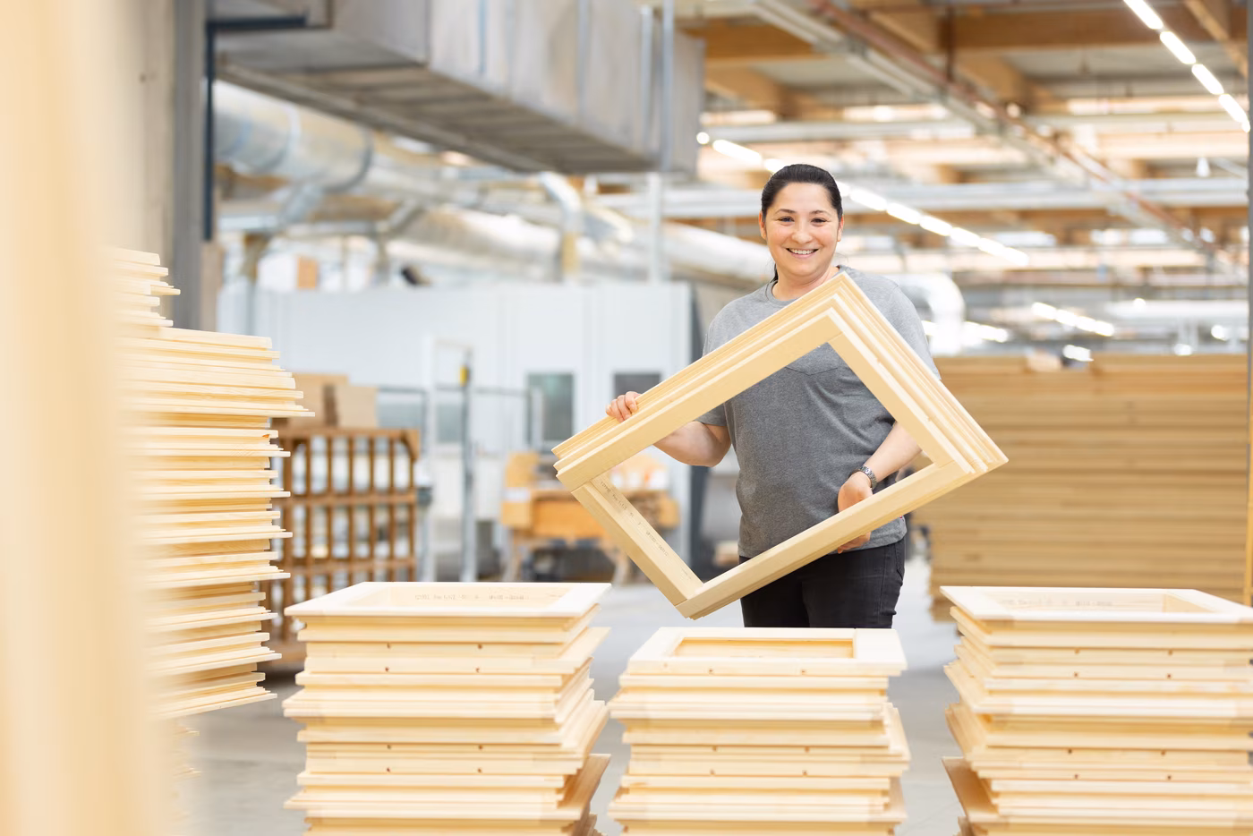 Im nächsten Schritt werden die bearbeiteten Teile zu den Leimstationen gebracht. Der Leim wird händisch angebracht und mit hydraulischen Pressen zu Rahmen gepresst. Diese kommen dann zur Putzstation, werden dort kontrolliert, eventuell manuell nachbearbeitet, auf Rollwagen abgestellt und an eine automatische Förderanlage gehängt. Dort werden sie zwei Mal mit wasserlöslicher Tauchimprägnierung geflutet und in einem Trocknungskanal getrocknet. Als nächster Schritt folgt der Zwischenschliff, der bei fast allen Rahmen automatisiert passiert. Danach werden die Rahmen bei einer Förderanlage aufgehängt und vollautomatisch mit Acryllack und Lasuren, allesamt auf Wasserbasis, lackiert und im Trockenkanal getrocknet.