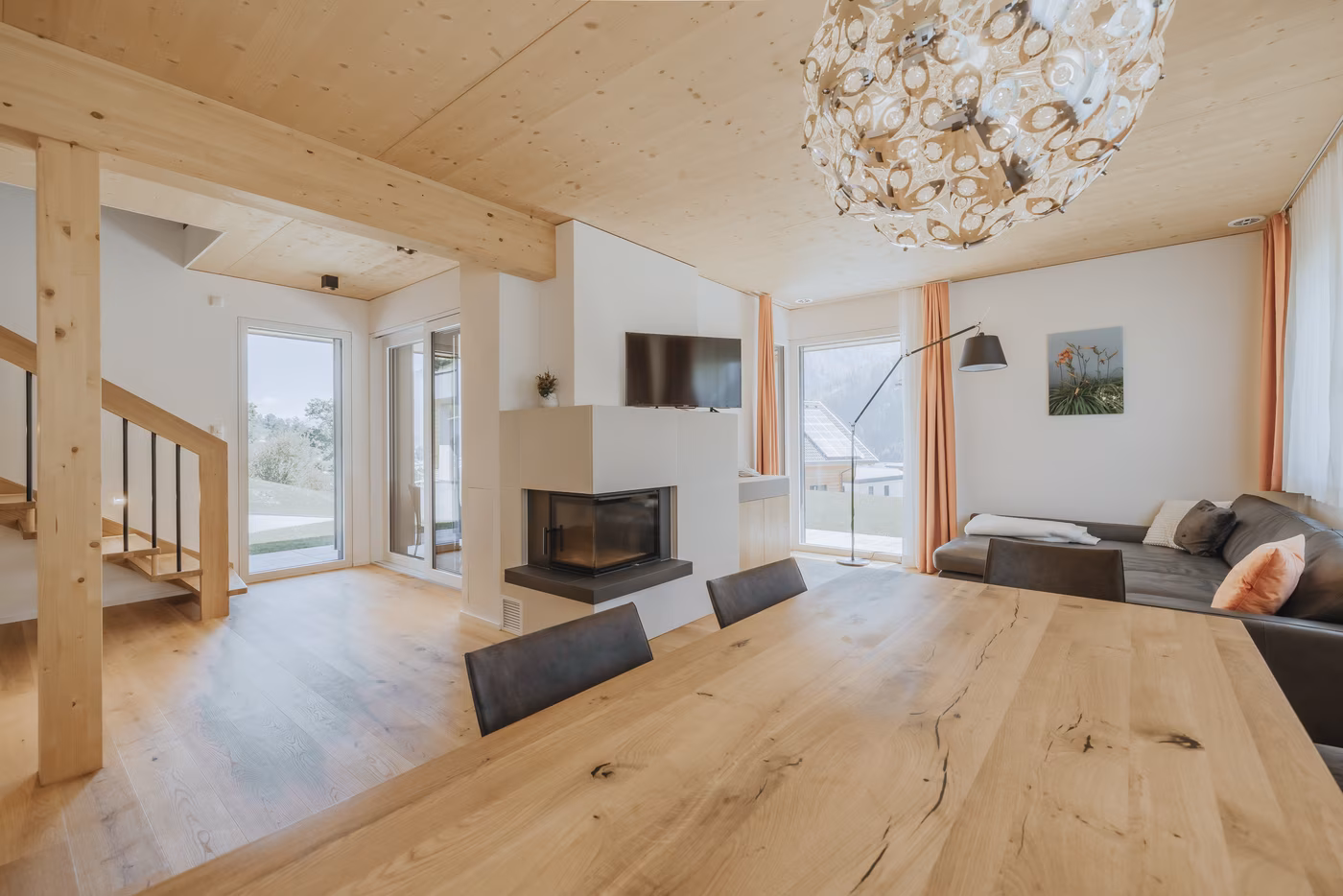 Für Familie Webhofer war es wichtig, dass ihr Haus eine ruhige Anmutung ausstrahlt und sich charmant in einen ländlich geprägten Kontext eingliedert. Das Holzhaus mit grauer Fassade ist schlicht, elegant und unaufgeregt. Dazu passend wurde auch die Ausführung der Fenster und Türen gewählt. Besonders großen Wert legten die Webhofers auf einen flächenbündigen Einbau, so dass Wände und Fenster fast ineinander verschmelzen. Dem Trend folgend, entschieden sie sich für 98er Holz-Alu-Fenster. Insgesamt wurden von unseren Kollegen in Lienz 18 Fenster, eine Hebe-Schiebe-Türe und eine Balkontüre sowie eine passende Eingangstüre verbaut.